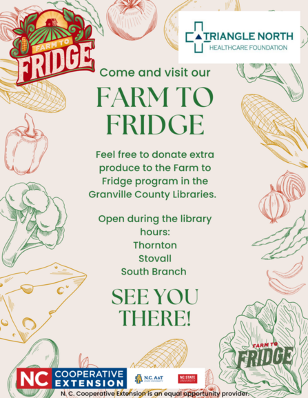 Pictured above are representatives of Granville County Cooperative Extension at the Oxford Armory Farmers Market. Granville County Cooperative Extension is a recipient of a Strategic Small grant for the Farm to Fridge Program. This program allows community members in need to go to their local library and get donated nutritious food. Food is provided by local groceries stores, the food bank, churches, and other sources of excess food.